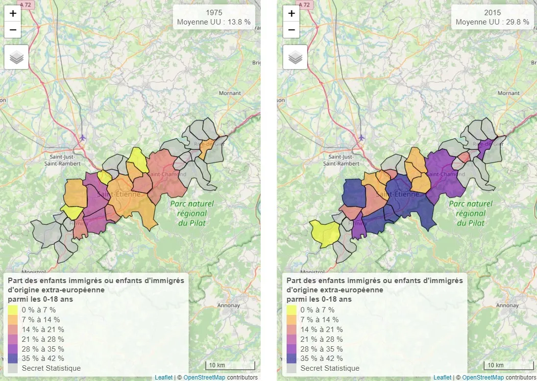 A 0-18 év közötti migrációs hátterű gyerekek aránya Saint-Etienneben 1975-ben és 2015-ben