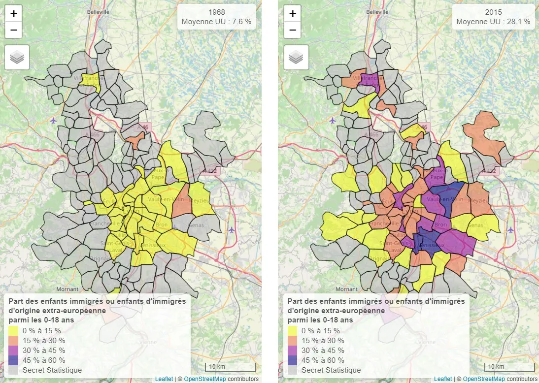A 0-18 év közötti migrációs hátterű gyerekek aránya Lyonban 1968-ban és 2015-ben