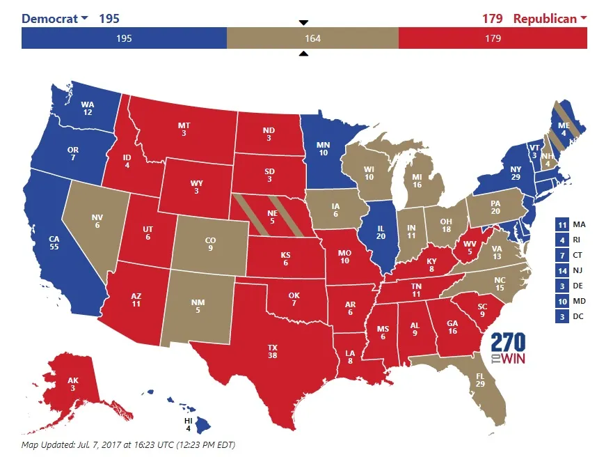 A csatatér államok száma egyébként választásról választásra picit változni szokott. Illetve a különböző közvéleménykutatók is más-más államokat szoktak ezzel a jelzővel illetni. A számuk általában 5 és 15 között mozog.