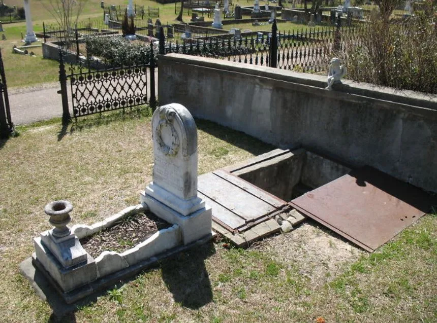 Első pillantásra teljesen normálisnak tűnhet ez a sír a mississippi Natchez városi temetőben. Közelebb sétálva azonban feltűnhet, hogy egy titkos ajtó van a sír mögé építve, amely a koporsóhoz vezet.