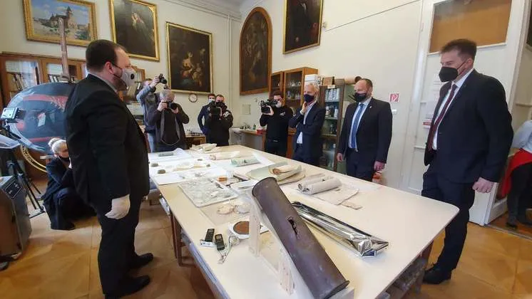 Április 15-én, csütörtökön mutatták be a sajtó munkatársainak annak a 176 éves időkapszulának a tartalmát, amit az esztergomi Bazilika száz méter magasban lévő keresztjéből emeltek ki még januárban, a székesegyház felújítása során.