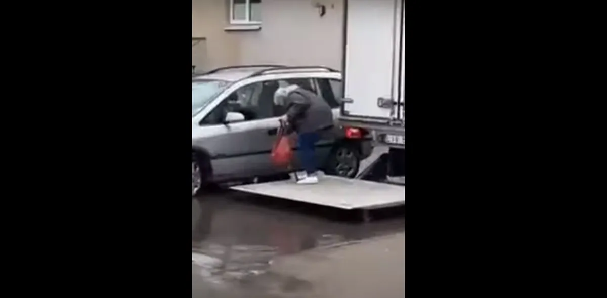 A körülmények ismeretlenek, de annyi biztos, hogy a nagy esőzés miatt egy idős hölgy nem tudta megközelíteni az autóját, mert valószínűleg nem akart nyakig sárosan beleülni. Ám éppen arra járt egy teherautós páros, akik nem késlekedtek segítséget nyújtani.