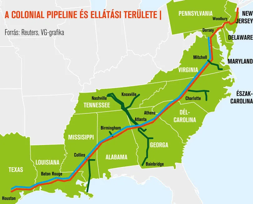 A Texastól New Jersey-ig futó 8850 kilométeres Colonial Pipeline nevű üzemanyag vezetéket péntekről szombatra virradó éjszaka kellett teljesen leállítani egy heckertámadás miatt. A vezetéken naponta csaknem 400 millió liter benzin, gázolaj és kerozin vándorol egyik helyről a másikra: többek között az atlantai Hartsfield Jackson repülőtér, valamint az évi 50 milliós utasforgalmú észak-karolinai Charlotte Douglas légikikötő is ezen keresztül vételez üzemanyagot a repülőgépek számára. De a délkelet-amerikai tagállamokban található benzinkutak döntő többsége is a vezetéken keresztül jut a finomított folyékony aranyhoz ideális körülmények között.