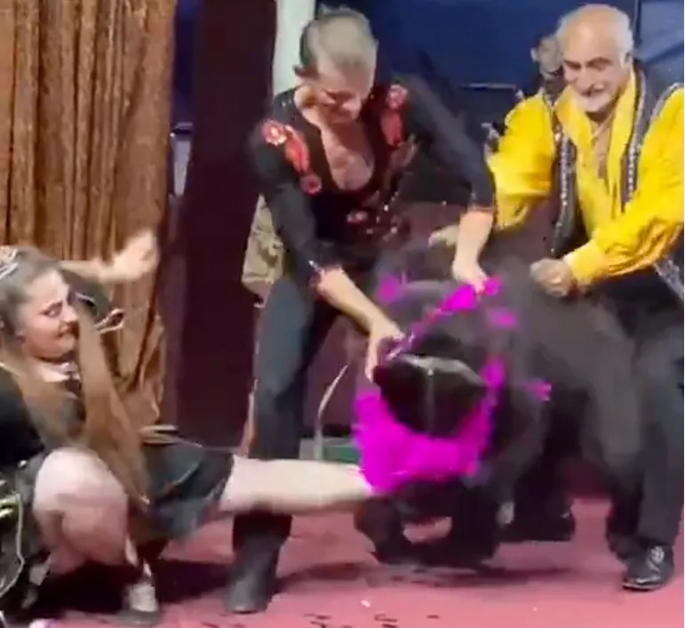 A kalapba és csillogó sálba öltöztetett állat elkapta a nő lábát és marcangolni kezdte azt. Végül a többi idomár sietett az áldozat segítségére, aki szerencsére egy nagyobb ijedtséggel megúszta az incidenst.