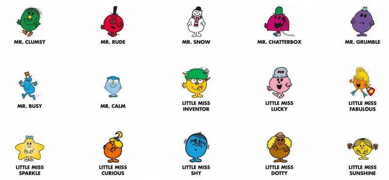 A lista első helyére került a Mr. Men sorozat, amelyet 1971-ben tettek közzé először. Roger Hargreaves klasszikus mesekönyvében színes és furcsa alakú szereplők vannak, az egyetlen gond velük az, hogy konkrét nemi identitással bírnak. Vagyis a Mr. Men sorozatban minden figura férfi. Az író másik, ehhez hasonló sorozatában, a Miss-ben pedig mindenki nő. A könyvecskék 2021-ben ünnepelték az első kiadásuk 50. évfordulóját.