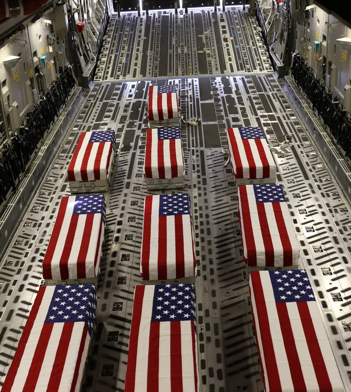 A katonai búcsúztatásnak megfelelően lobogóval fedték le a koporsókat, úgy szállítják haza a Kabulban meggyilkolt amerikai katonák holttestét. Bajtársaik kíséretében tették meg az utat a repülőgépig, hogy otthon a család és a barátok is el tudjanak búcsúzni tőlük.