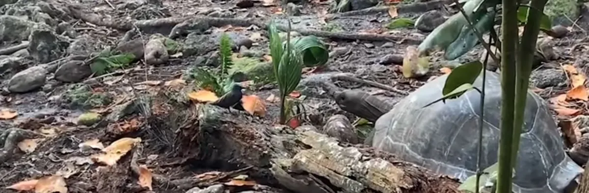 A felvétel még 2020 júliusában készült a szigetcsoport Fregate nevű tagján. Látható rajta, amint egy nőstény óriásteknős lassan követ egy fiatal barna noddit (anous stolidus), rá-rácsap, míg végül sikerül a madár fejét az állkapcsai közé kapnia.