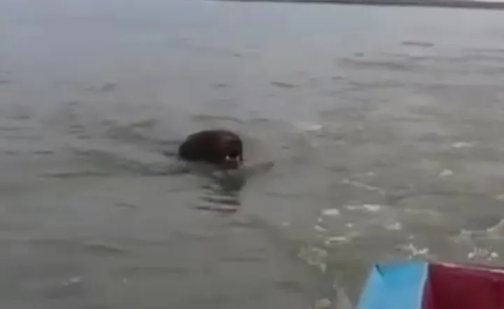 Az állat szemmel láthatóan dühös, fújtató hangot ad ki, ami az agresszivitás jele. Kis híján utoléri a csónakban utazó embereket, de végül a társaságnak sikerül szerencsésen elmenekülni a támadó elől.