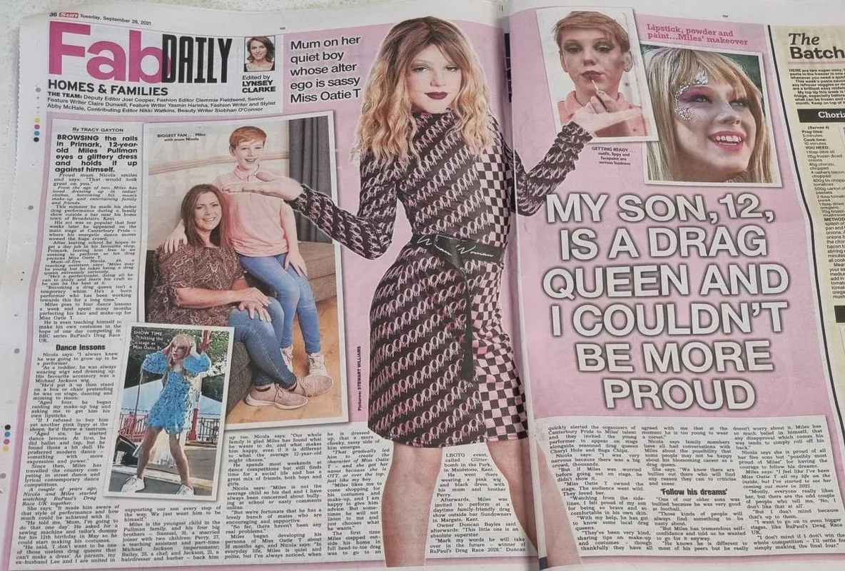 A 12 éves, Nagy-Britanniában élő Miles Pullman már kétéves kora óta szeret női ruhákba öltözni, kölcsönkéri az anyja sminkjét, és szórakoztatja a családot és a barátokat. Ezért tavaly nyáron az édesanyja támogatásával úgy döntött, hogy a szülővárosában, Broadstairsben tart egy bemutatót a helyi melegbár előtt, ami olyan jól sikerült, hogy négy héttel később a Canterbury Pride főszínpadán is megjelenhetett. Nicola, Miles édesanyja azt mondta, hogy már a kezdetektől támogatta fiát, aki drag queen akart lenni. De honnan tudott arról egy gyerek, hogy egyáltalán van ilyen?