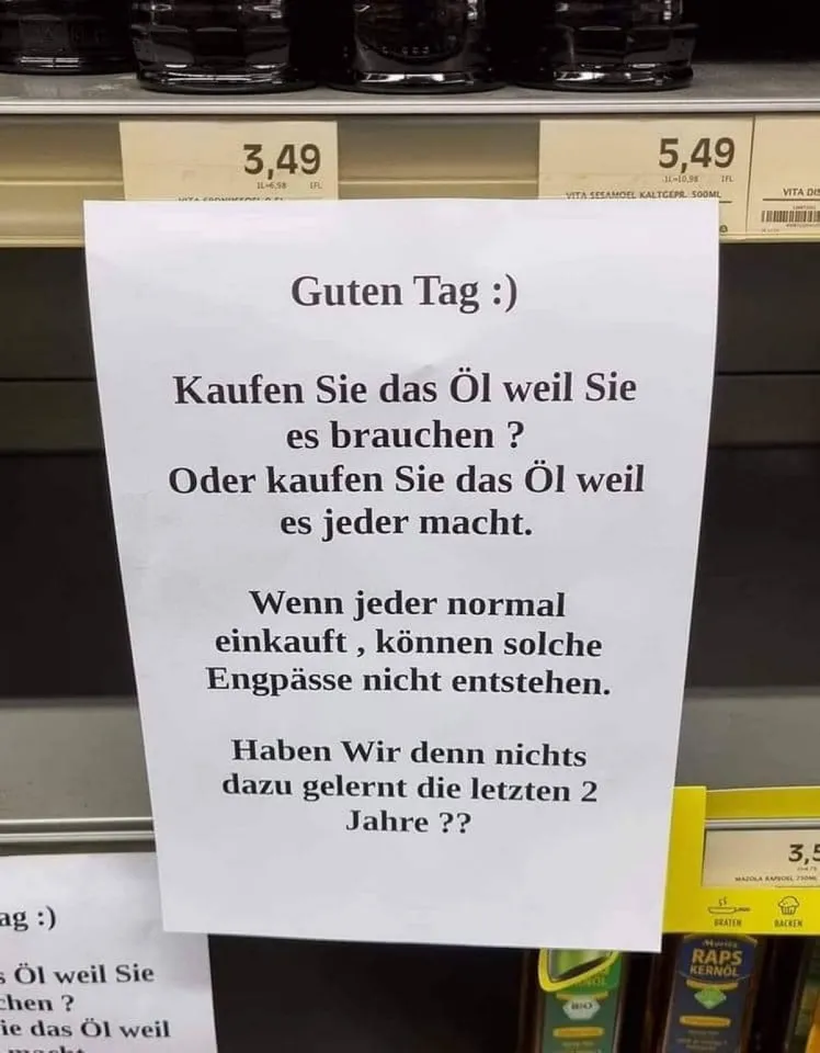"Jó napot! Azért vásárolsz olajat, mert szükséged van rá vagy azért, mert mindenki ezt csinálja? Ha mindenki normálisan vásárol, akkor nem jön létre hiány. Semmit nem tanultunk az elmúlt 2 évben?" - teszi fel a vásárlóknak a kérdést a kiragasztott ironikus felirat.