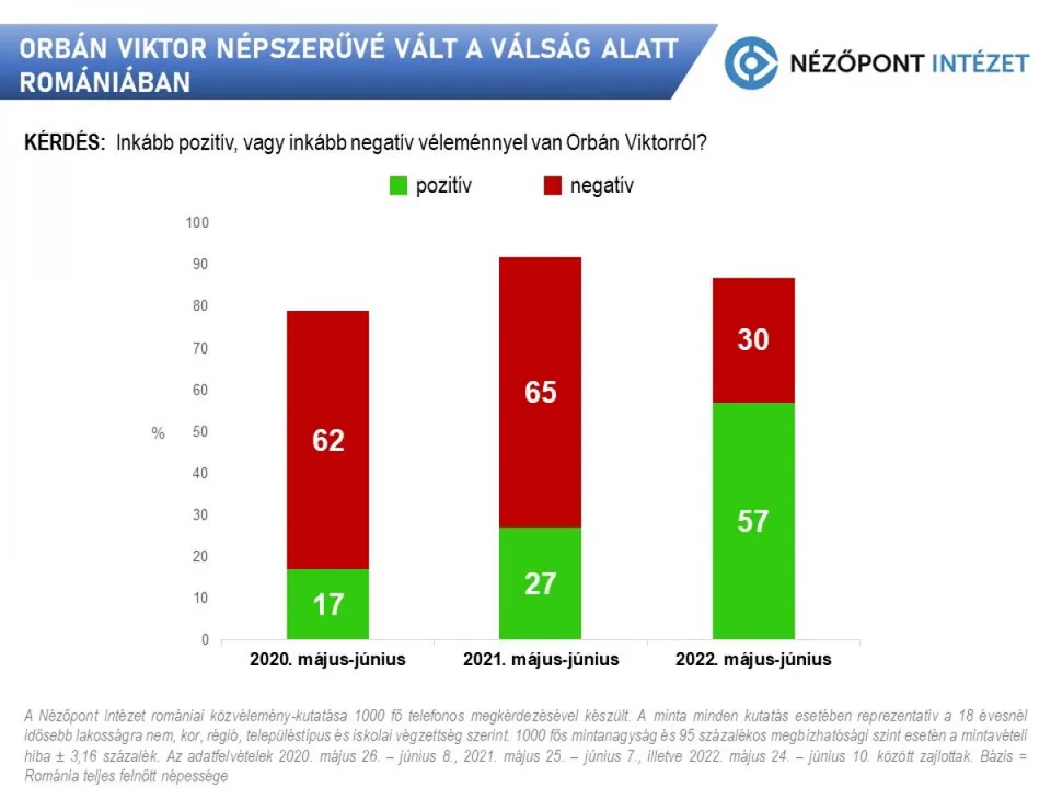 Módszertan – Az elemzésben felhasznált adatok a Nézőpont Intézet Romániában, 1000 fő telefonos megkérdezésével készített közvélemény-kutatási eredményei. A minta minden kutatás esetében reprezentatív a 18 évesnél idősebb lakosságra nem, kor, régió, településtípus és iskolai végzettség szerint. 1000 fős mintanagyság és 95 százalékos megbízhatósági szint esetén a mintavételi hiba ± 3,16 százalék. Az adatfelvételek 2020. május 26. – június 8., 2021. május 25. – június 7., illetve 2022. május 24. – június 10. között zajlottak. Bázis = Románia teljes felnőtt népessége.