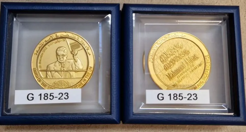 két aranyérme Mahmúd Abbász palesztin elnök képével,