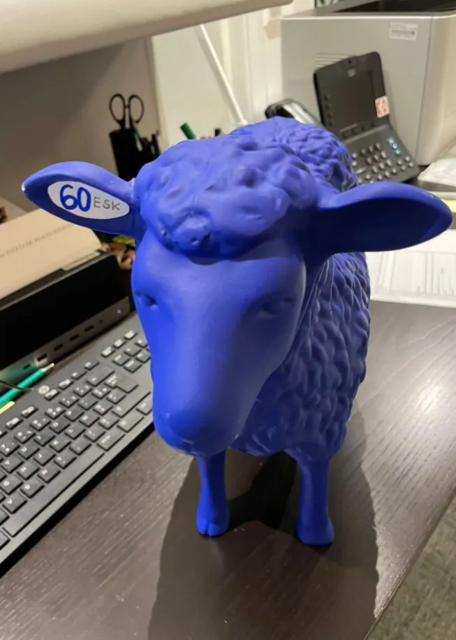 egy kék juh szobrocska, amelyet a karlsruhei Európai Iskola adott Metsolának.