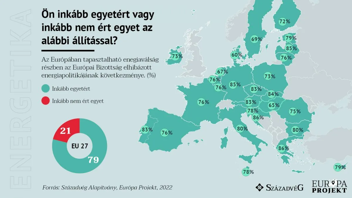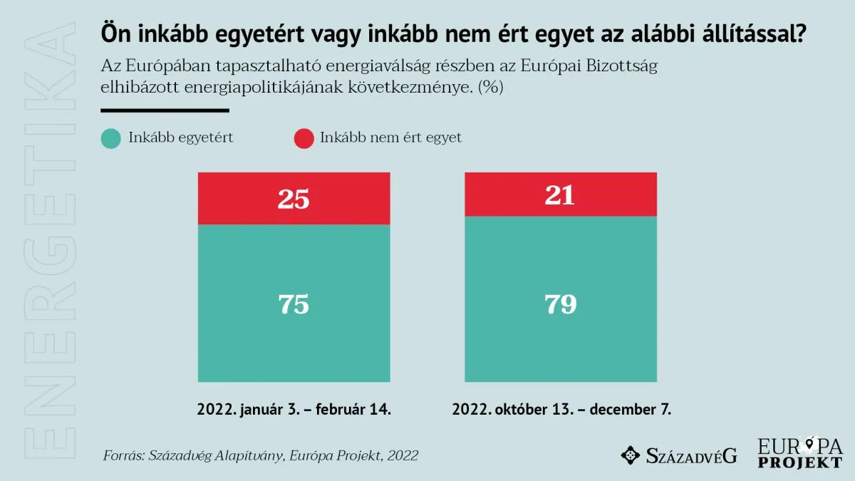 A 2022 őszén készített kutatásban már a válaszadók csaknem négyötöde (79 százaléka) nyilatkozott úgy, hogy a kialakult helyzetért részben az Európai Bizottság elhibázott energiapolitikája felelős.