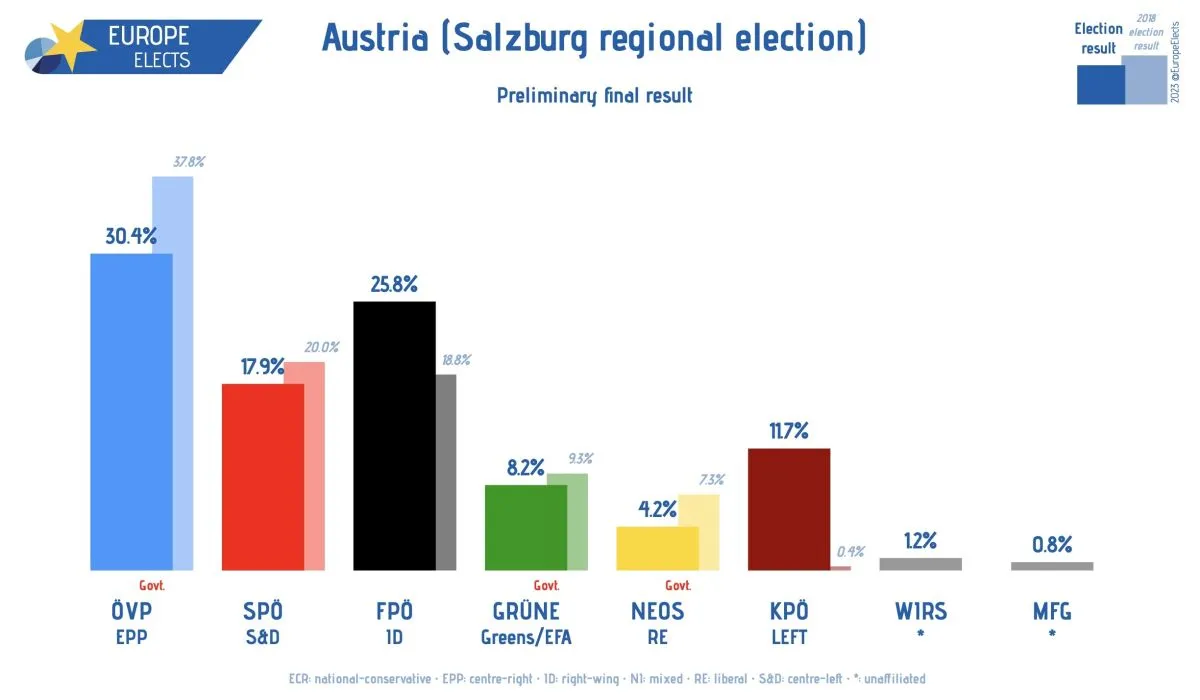 A jobboldali pártok elsöprő győzelmével zárult a Salzburg tartományban megrendezett regionális osztrák választás vasárnap. A kereszténydemokrata Osztrák Néppárt (ÖVP) 30,4 százalékos eredménnyel az első helyen, az Osztrák Szabadságpárt (FPÖ) 26 százalékkal a második helyen, Ausztria Szociáldemokrata Pártja (SPÖ) pedig a haramdik helyen végzett a maga 17,6 százalékával. Az hitelesített végeredmény fényében borítékolható, hogy az eddigi tartományi koalíció felbomlik, mivel a Zöldek (8,2 százalék) és a liberális NEOS párt (4,2 százalék) nem tudja már biztosítani az abszolút többséget a tartományi törvényhozásban az eddigi partnerükkel a Néppárttal. Elemzők szerint a legvalószínűbb forgatókönyv, hogy Osztrák Néppárt (ÖVP) és Osztrák Szabadságpárt (FPÖ) alakít majd erősen jobboldali kormányt a nyugati tartományban.