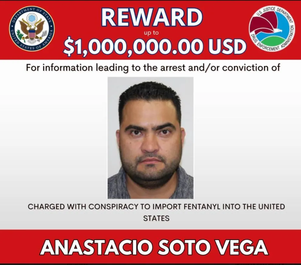 Lapinformáció szerint Anastacio Soto Vegát és társait fentanilbehozatallal, gépfegyverek és pusztító eszközök birtoklásával, valamint gépfegyverek és pusztító eszközök birtoklására irányuló összeesküvéssel vádolják. Az Egyesült Államok külügyminisztériuma 1 millió dollárt ajánl a bűnöző elítéléséhez vezető információkért.