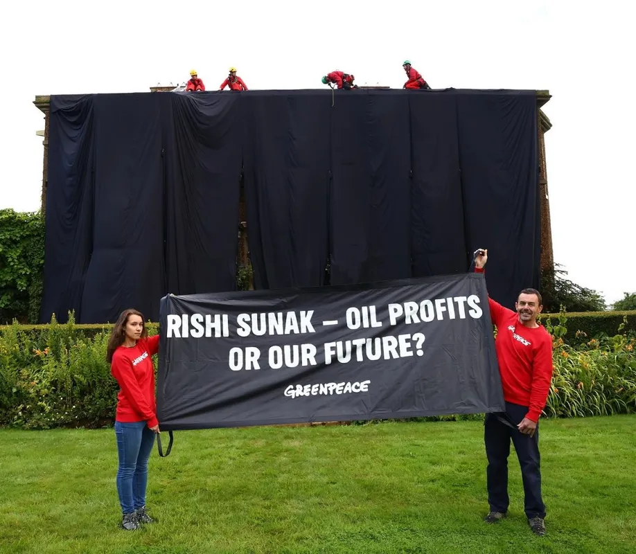 A Greenpeace környezetvédelmi szervezet közleménye szerint Rishi Sunak műemléki védelem alatt álló házát profi hegymászók takarták le 200 méter "olajfekete" fóliával. Az akció végén az aktivisták egy "Rishi Sunak – olajnyereség vagy jövőnk?" feliratú molinót feszített ki a lefóliázott ingatlan előtt.