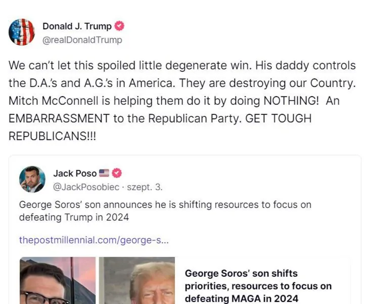Donald Trump korábbi amerikai elnök, – aki most jó eséllyel fut neki, hogy ismét a republikánusok jelöltje legyen a jövő évi választáson – a közösségi oldalán szólt oda a Soros-birodalom ifjú vezetőjének, Alexander Sorosnak, miután egy cikk jelent meg azzal a címmel, hogy az aranyifjú átcsoportosítja a civil szervezetinek erőforrásat, hogy 2024-ben Trump mozgalmának legyőzésére összpontosítson - írta meg a Mandiner.