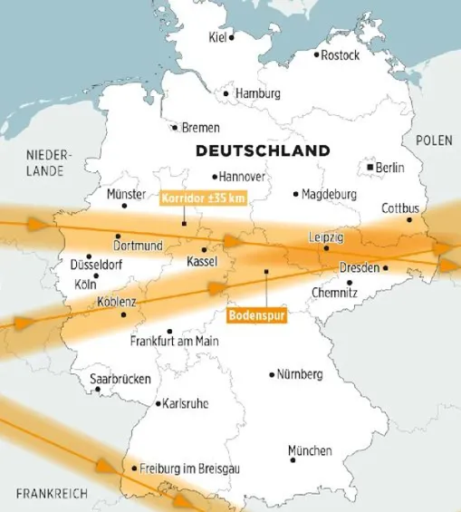 Az előzetes számítások szerint március 8-án négy, körülbelül másfél perces időablakban, 16:47 és 19:50 között űrszemét érheti el Németországot, három lehetséges átrepülési útvonalon.