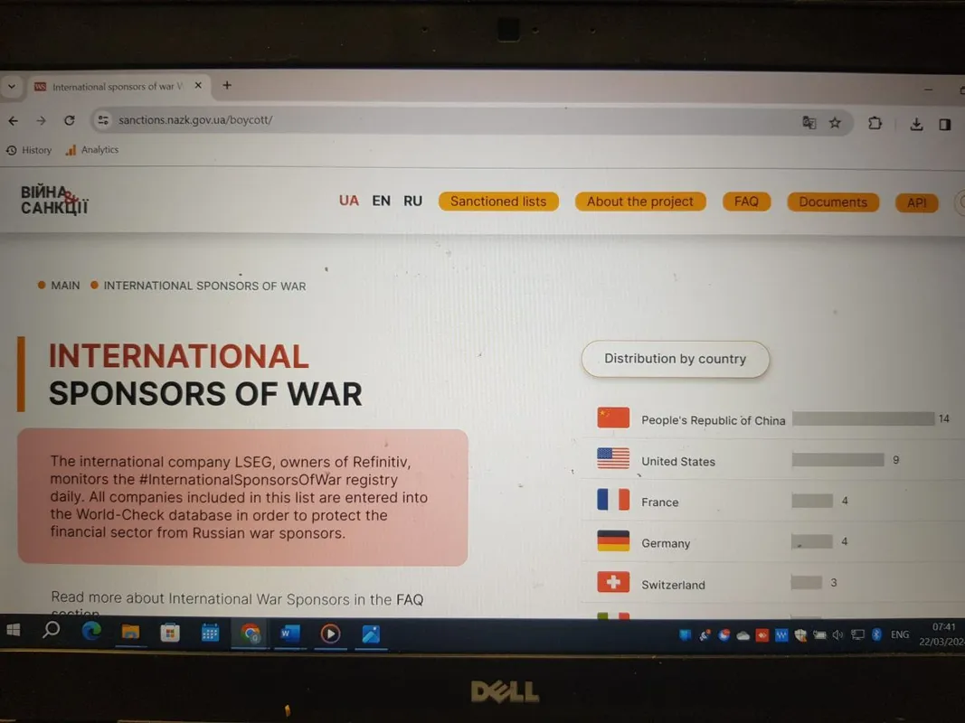 A „háború nemzetközi szponzorainak" listáját közvetlenül a orosz-ukrán konfliktus kirobbanása után, 2022 februárjában vezette be az ukrán Nemzeti Korrupciómegelőzési Hivatal (NACP). A kormányzati ügynökség egy korábbi tájékoztatása szerint a listára olyan multinacionális nagyvállalatokat vettek fel, amelyek „közvetlenül segítették vagy hozzájárultak Oroszország háborús erőfeszítéseihez.” Megszűnése előtt a listán közel 40 nemzetközi márka szerepelt, köztük olyan nagyvállalatok, mint a német Metro, és a francia Auchan kiskereskedelmi áruházlánc, a szintén francia Bonduelle konzervgyártó vállalat, az osztrák Raiffeisen Bank és az amerikai Mondelez édességgyártó multi.
