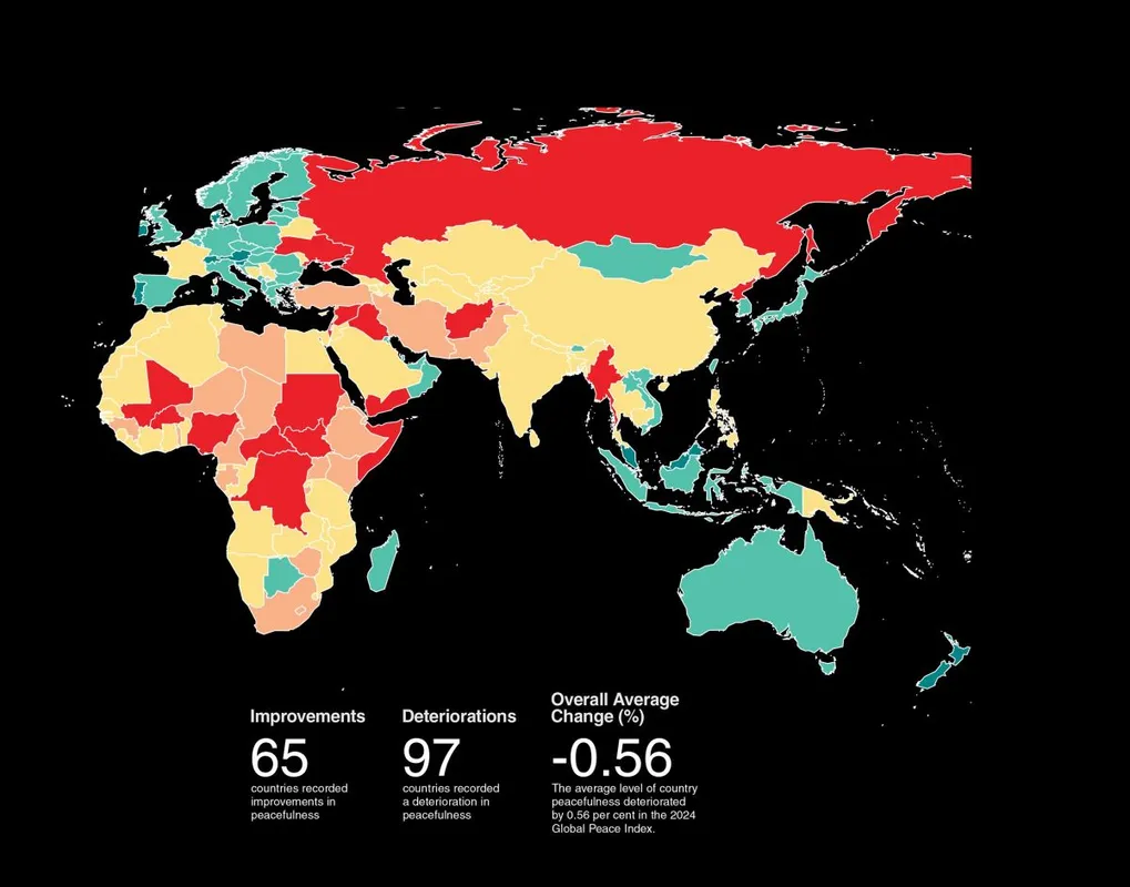 A napokban publikált 2024-es elemzés szerint a világ országai közül 97-ben romlott a békesség szintje tavalyhoz képest, ami a legrosszabb eredmény a jelentés első, 2008-as összeállítása óta. Szintén negatív rekordnak számító adat, hogy jelenleg 93 ország érintett határain kívüli konfliktusokban.
