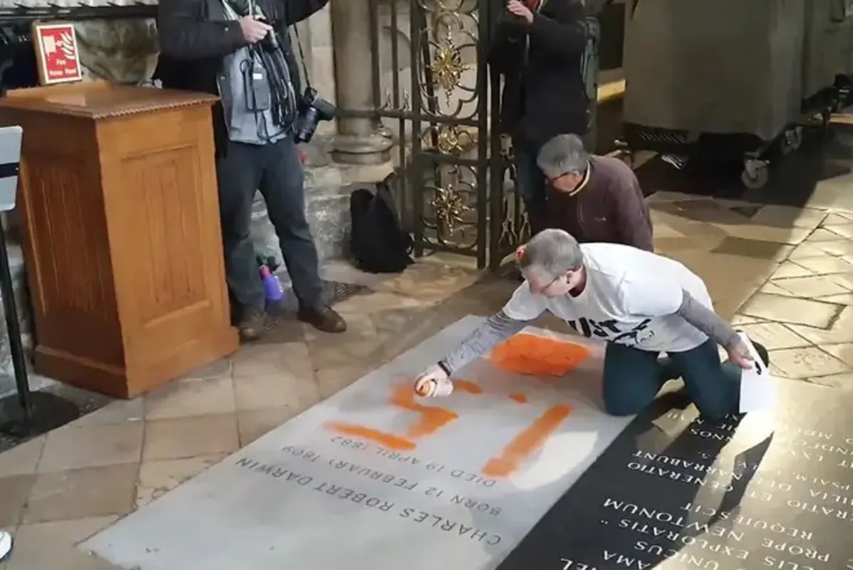 Az incidens a londoni parlamenttel szemközt emelkedő ősi Westminster-apátságban történt hétfő reggel. A brit közmédia beszámolója szerint a fosszilis üzemanyagok használata ellen küzdő "Just Stop Oil" nevű környezetvédő csoport két tagja narancssárga festékkel fújta le a tudós síremlékét. A két elkövetőt, egy 66 éves és egy 77 éves nőt a rendőrség szándékos rongálás gyanújával a helyszínen őrizetbe vette.