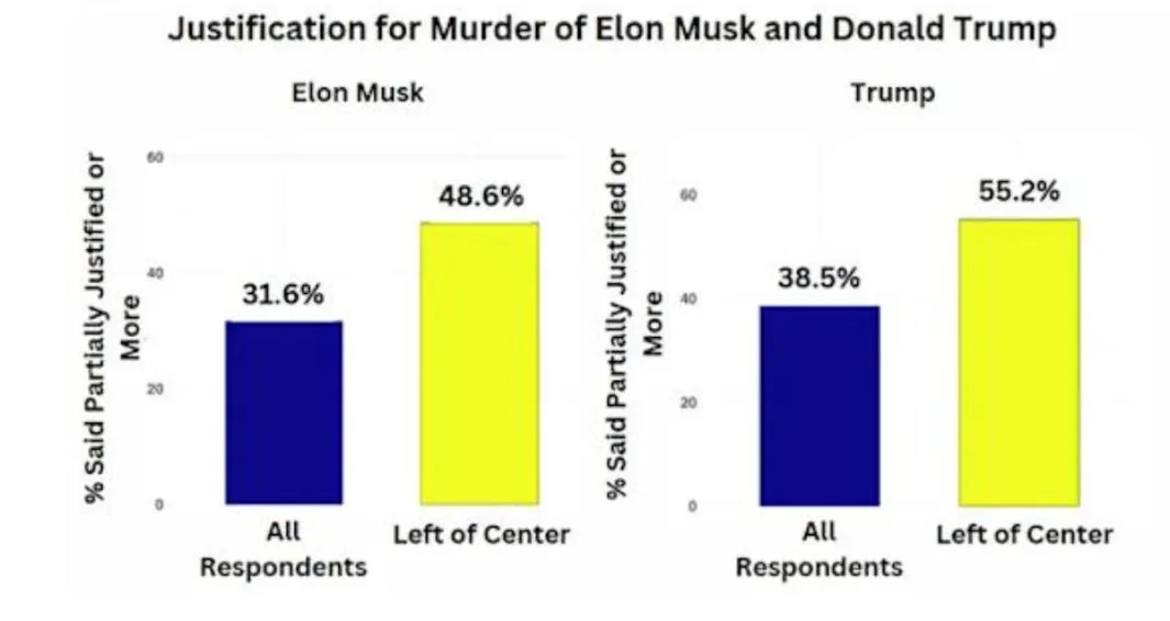 Az 1200 ember megkérdezésével készült felmérés szerint az emberek 38 százaléka látná igazoltnak Donald Trump meggyilkolását, míg a baloldali elköteleződésű válaszadók körében ez az arány már 55 százalék. Az utóbbi csoportban a válaszadók 13,2 százaléka szerint lenne "teljesen indokol" az elnök megölése.