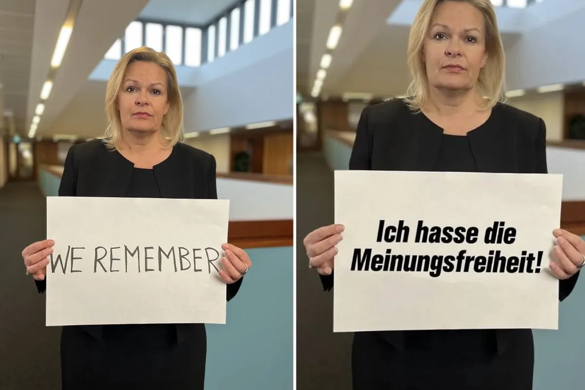 A fotó eredeti változatán a „We Remember”, azaz az "Emlékezünk" felirat szerepelt, és a holokausztra való emlékezés részeként töltötték fel Faeser hivatalos közösségi oldalára. Tehát Bendels csak a táblán szereplő feliratot cserélte ki a képen, majd újraközölte azt.