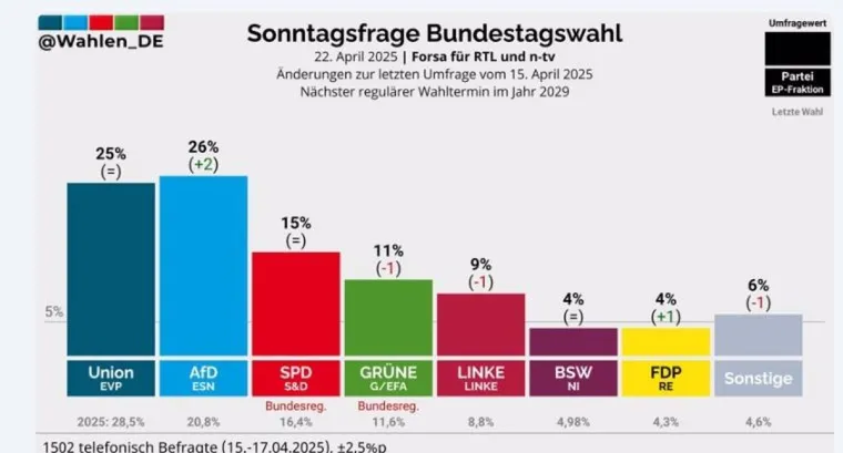 Az AfD minden idők legmagasabb országos közvélemény-kutatási értékelését érte el. Ha jövő vasárnap szövetségi választások lennének, 26 százalékuk szavazna a pártra – derül ki abból a friss felmérésből, amelyet a Forsa közvélemény-kutató intézet készített az RTL és az ntv megbízásából.