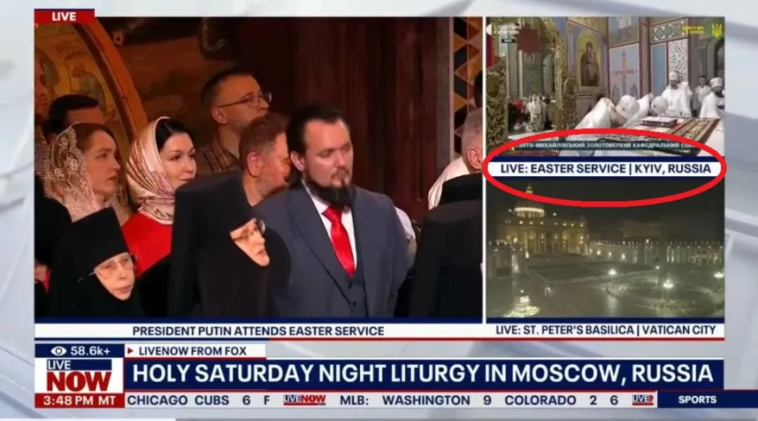 A baki április 20-án történt, miközben a Fox News húsvéti istentiszteletekről közvetített adásokat a világ számos pontjáról, köztük egy moszkvai szertartásról Vlagyimir Putyin orosz elnök részvételével. Az adásba akkor csúszott hiba, amikor a jobboldali, kisebb élőképeken a kijevi szertartást is megjelent, "Kijev, Oroszország" felirattal. Az elírás állítólag közel fél órán keresztül volt látható a képernyőn, mielőtt kijavították volna.