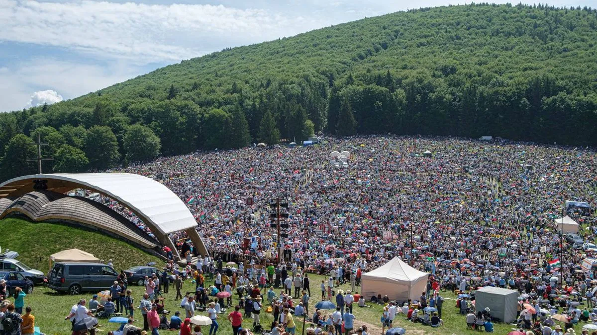 A borongós, esős idő ellenére a hangulat ünnepélyes és felemelő volt, az emberek esernyőkkel, zászlókkal és népviseletben gyülekeztek a hegyoldalon, sokan már előző este elfoglalták helyüket. Ferenc pápa megjelenésekor elállt az eső és a felhőkön átragyogott a nap, aminek sokan szimbolikus jelentőséget tulajdonítottak. A mise során Ferenc pápa a megbékélés és a testvériség üzenetét hirdette, magyarul is megszólalva