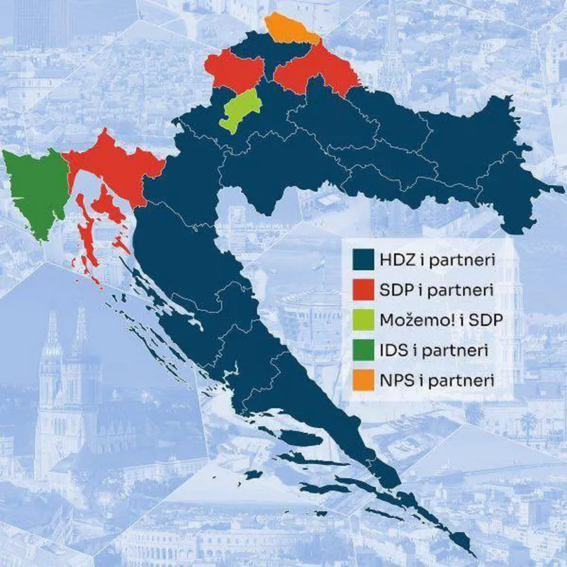 A HDZ 21 megyéből 15-ben nyert és a 127 horvát városból 61-ben választottak HDZ-s polgármestert, a 420 járásból pedig 204-ben HDZ-s elöljárót. Ez azt jelenti, hogy az 576 közigazgatási egységből 280-at szerzett meg a kormányzó párt.