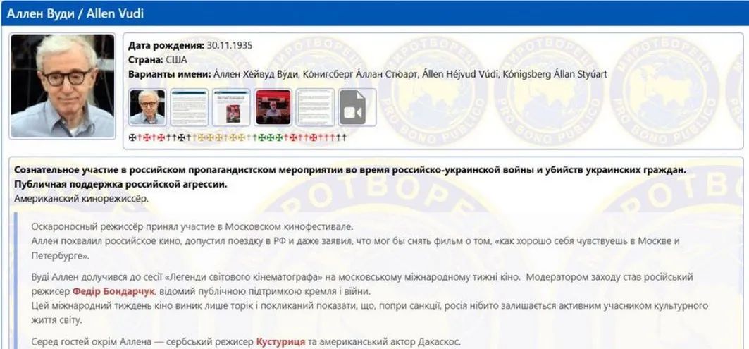 Woody Allen amerikai filmrendező és színész felkerült az „Ukrajna ellenségeit” listázó Mirotvorec adatbázisába, amit a köznyelvben gyakran csak "ukrán halállistaként" emlegetnek - írja a The Times brit hetilap online kiadása.