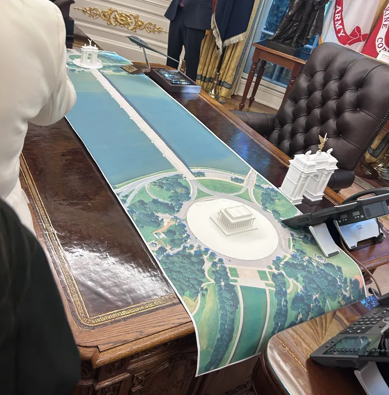 ATrump-kormány egyelőre nem adott ki hivatalos közleményt az ovális irodában felállított makettről. A kicsinyített diadalív csütörtökön bukkant fel először, amikor a finn miniszterelnök meglátogatta az amerikai elnököt a Fehér Házban. Az eseményről készült fotók tanúsága szerint Trump asztalára egy műholdas térképet terítettek ki Washington D.C.-ről, amelyen a Lincoln-emlékművel szemben, a Potomac folyó túloldalán egy elképzelt diadalív állt.