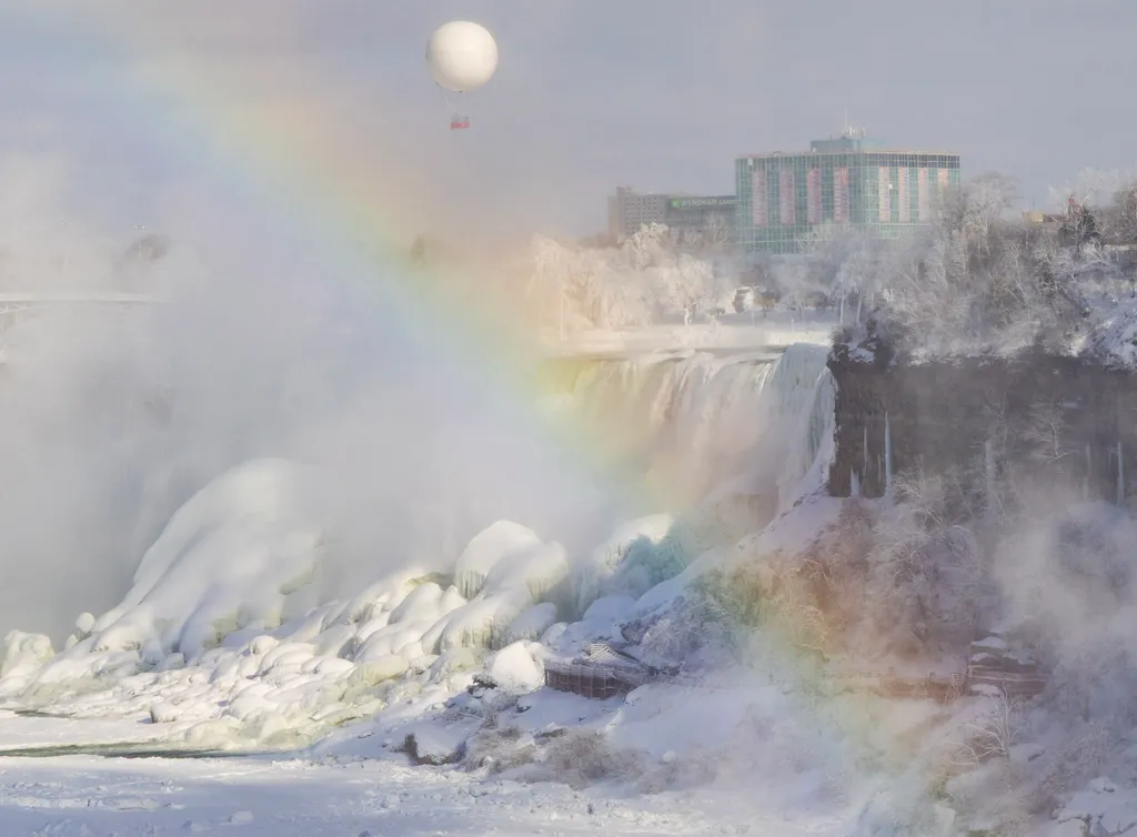 Bár a hatalmas víztömeg miatt a vízesés soha nem fagy be teljesen, a rendkívüli hideg jelentős jégfelhalmozódást okozott a peremeken, a hidakon és a környező területeken, így fagyos csodaországgá változott a nevezetesség.