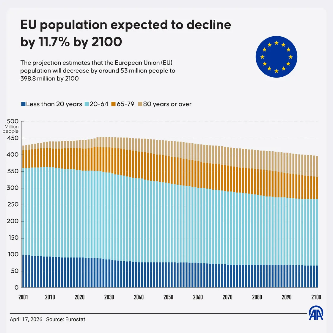 Az Eurostat számítások szerint az EU népessége a következő években még enyhén növekedhet a migráció miatt, majd néhány év stagnálás után a lakosság folyamatosan csökkenni fog. Az évszázad végére pedig a EU népessége mintegy 400 millió főre zsugorodhat, ami nagyjából 50 milliós visszaesést jelent a jelenlegi 450 milliós lélekszámhoz képest.