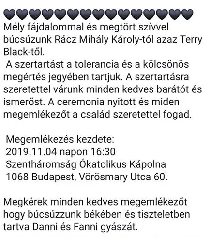 A búcsúztatóra Budapesten, a Szentháromság Ókatolikus Kápolnában kerül majd sor. A szertartás nyitott, a család mindenkit szeretettel vár, aki szeretne elköszönni Terry-től, azaz Rácz Károlytól.