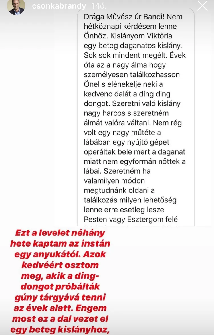 „Ezt a levelet néhány hete kaptam az instán egy anyukától. Azok kedvéért osztom meg, akik Ding-Dongot próbálták gúny tárgyává tenni az évek alatt. Engem most ez a dal vezet el egy beteg kislányhoz, akinek rendezek egy privát kis koncertet” – fogalmazott András.
