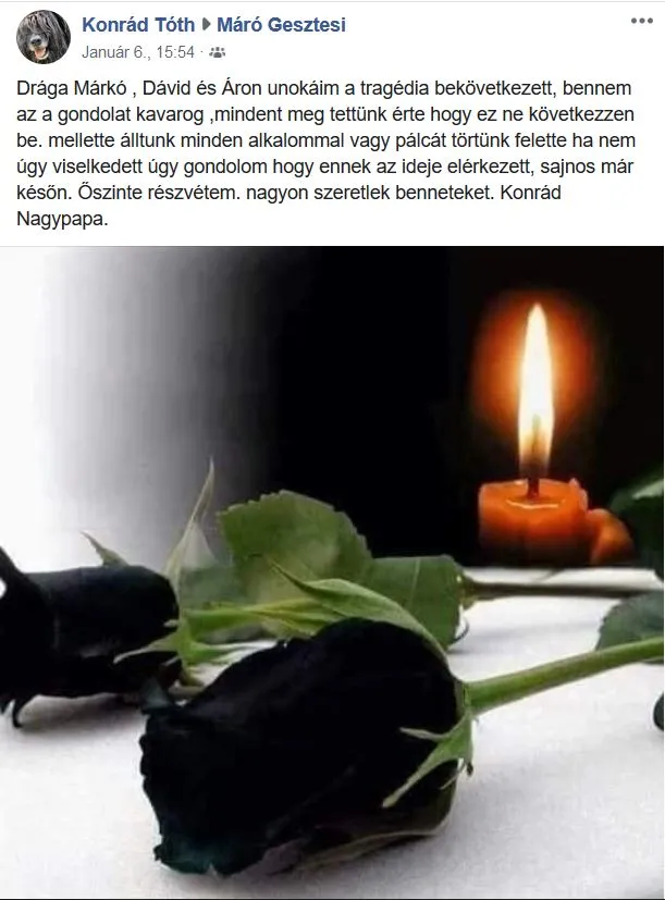 „Drága Márkó, Dávid és Áron unokáim. A tragédia bekövetkezett, bennem az a gondolat kavarog: mindent meg tettünk érte, hogy ez ne következzen be. Mellette álltunk minden alkalommal, vagy pálcát törtünk felette, ha nem úgy viselkedett. Úgy gondolom, hogy ennek az ideje elérkezett, sajnos már későn. Őszinte részvétem. Nagyon szeretlek benneteket. Konrád Nagypapa” – fogalmazta meg sorait Konrád.