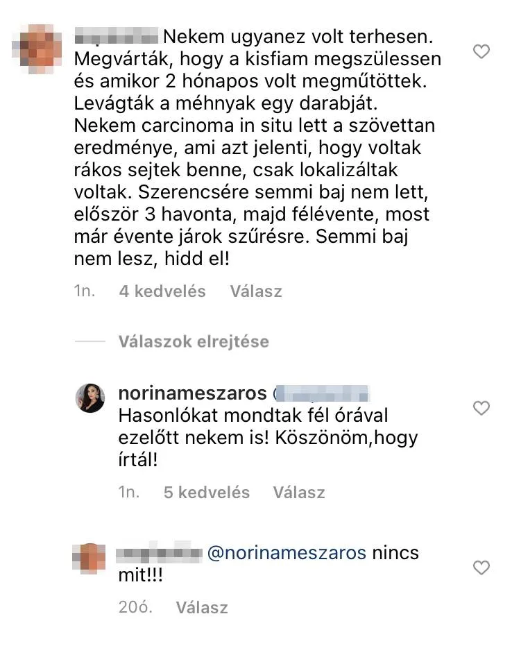 Egy követője ugyanis azt írta neki, hogy nem szabad félnie: őt magát is hasonló problémával diagnosztizálták, a szövettani mintájában pedig voltak ugyan rákos sejtek, de azok lokalizáltak voltak, és a hölgynek végül szerencsére semmi baja nem lett.