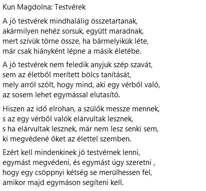 Ezen kívül Kun Magdolna a Testvérek című versét is megosztotta, amely a testvéri szeretetről szól, és arról, hogy a testvéreknek a halálukig össze kell tartaniuk, egy vérből valók, és sosem szabad hátat fordítaniuk egymásnak.