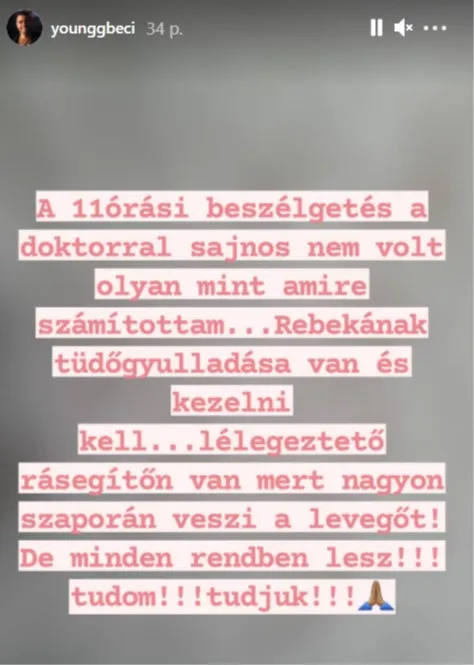 „A 11 órási beszélgetés a doktorral sajnos nem volt olyan, mint amire számítottam. Rebekának tüdőgyulladása van és kezelni kell. Lélegeztető rásegítőn van, mert nagyon szaporán veszi a levegőt. De minden rendben lesz. Tudom, tudjuk” – írta Instagram-oldalán a rapper.
