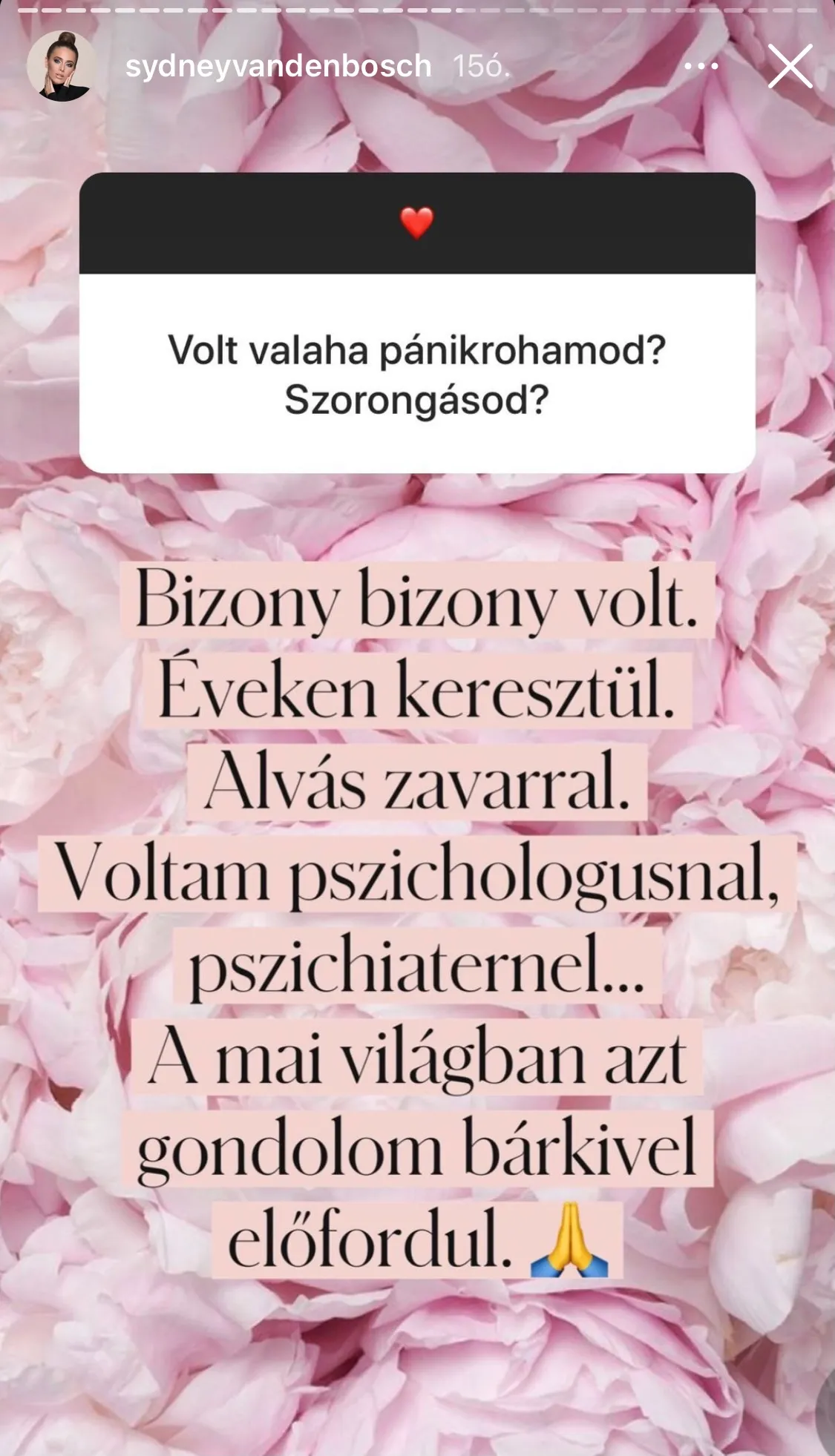 Arról kérdezték Sydney van den Bosch-t a rajongói az Instagramon, hogy küzdött-e valaha pánikrohammal vagy szorongott-e már valami miatt az elmúlt évek során. Nos, a Szerencsekerék női házigazdája mint mindig, ezúttal is teljesen őszintén válaszolt a kérdésekre. Így derült ki, hogy a modell is megküzdött ezzekkel a betegségekkel, problémákkal. Ráadásul szakemberek segítségét is kérte, hogy meggyógyuljon.