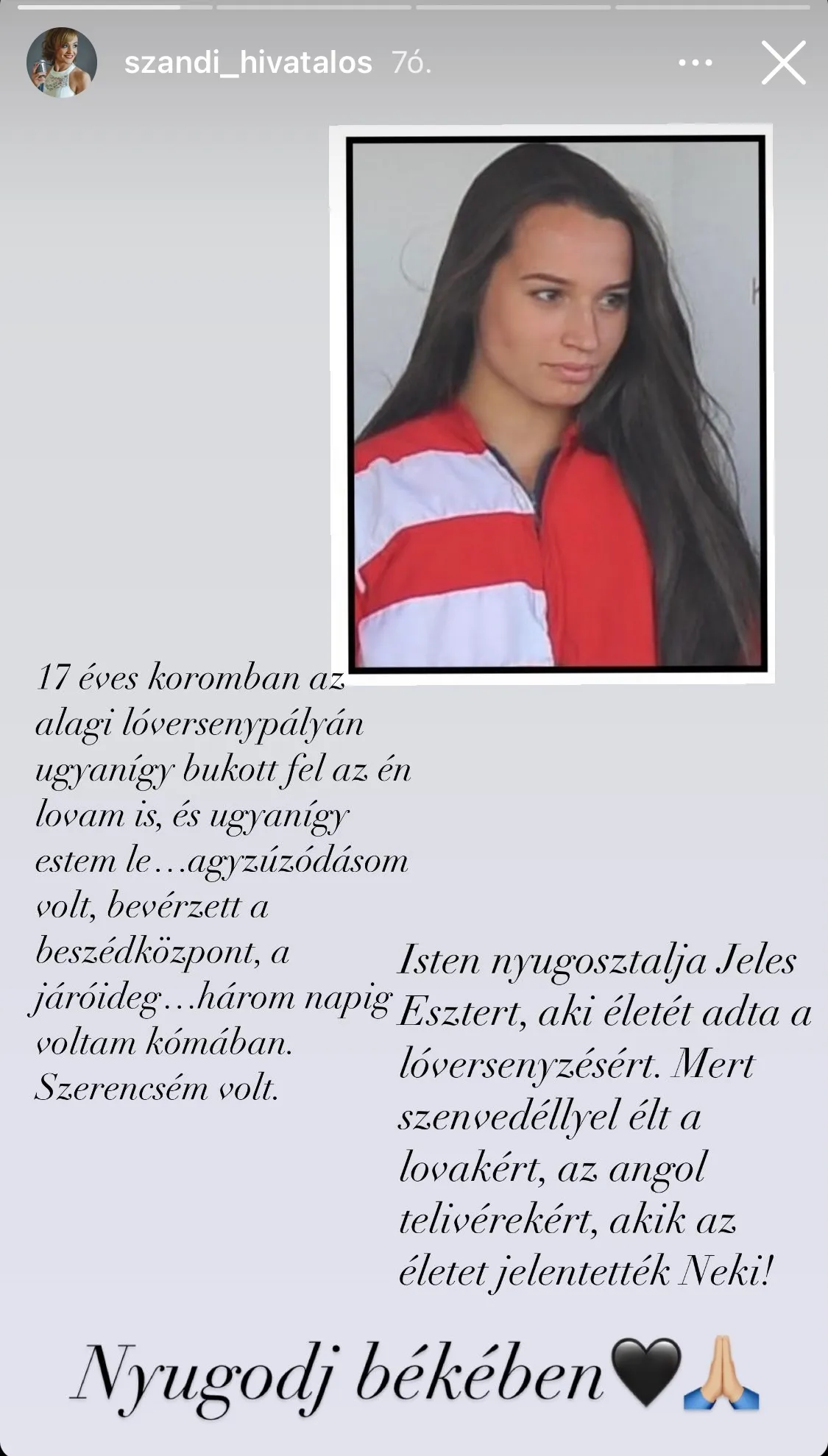 „17 éves koromban az alagi lóversenypályán ugyanúgy bukott fel az én lovam is, és ugyanígy estem le. Agyzúzódásom volt, bevérzett a beszédközpont, a járóideg. Három napig voltam kómában. Szerencsém volt” – írta instagramos bejegyzésében Szandi, aki nagyon sajnálja, ami a fiatal zsokélánnyal történt.