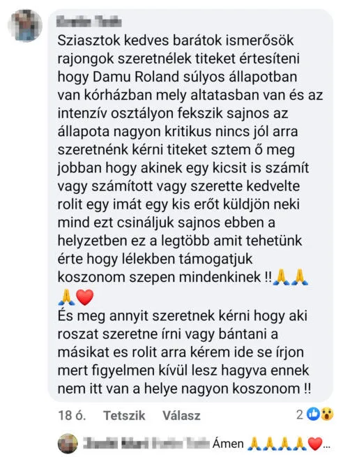 Mindenkit arra kért, hogy mondjanak egy imát Rolandért. A Bors információi szerint egyik kórházból a másikba szállították, és jelenleg is az életéért küzdenek.