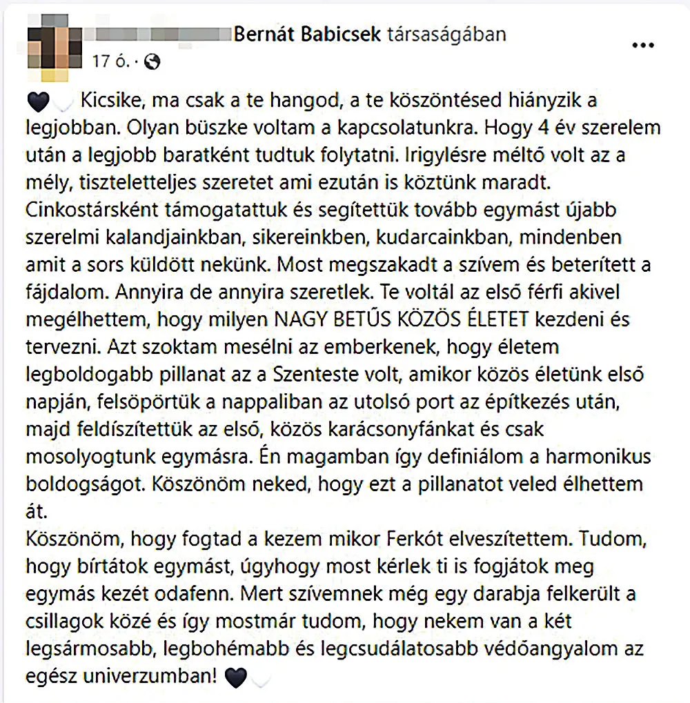 „Kicsike, ma csak a te hangod, a te köszöntésed hiányzik a legjobban. Olyan büszke voltam a kapcsolatunkra. Hogy 4 év szerelem után a legjobb barátként tudtuk folytatni. Irigylésre méltó volt az a mély, tiszteletteljes szeretet, ami ezután is köztünk maradt. Cinkostársként támogattattuk és segítettük tovább egymást újabb szerelmi kalandjainkban, sikereinkben, kudarcainkban, mindenben, amit a sors küldött nekünk. Most megszakadt a szívem és beterített a fájdalom. Annyira, de annyira szeretlek. Te voltál az első férfi, akivel megélhettem, hogy milyen NAGY BETŰS KÖZÖS ÉLETET kezdeni és tervezni. Azt szoktam mesélni az embereknek, hogy életem legboldogabb pillanata az a szenteste volt, amikor közös életünk első napján felsöpörtük a nappaliban az utolsó port az építkezés után, majd feldíszítettük az első, közös karácsonyfánkat, és csak mosolyogtunk egymásra. Én magamban így definiálom a harmonikus boldogságot. Köszönöm neked, hogy ezt a pillanatot veled élhettem át” – írta ki közösségi oldalára a szomorú szavakat Diána, aki hozzátette, hogy ezentúl védőangyalaként fog Bernátra gondolni, aki odafentről figyeli és óvja őt.