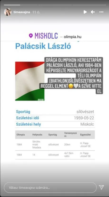 „Drága olimpikon keresztapám, Palácsik László, aki 1984-ben képviselte Magyarországot a téli olimpián (biathlon) sílövészetben, ma reggel elment. A szíve vitte el” – olvasható Vajna Tímea közösségi oldalán, amit elsőként a Bors vett észre.
