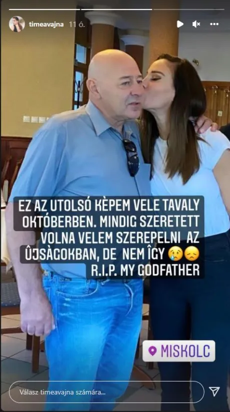 „Ez az utolsó képem vele tavaly októberben. Mindig szeretett volna velem szerepelni az újságokban, de nem így. R.I.P. my godfather” – írja a szívszorító kép mellett Timi.