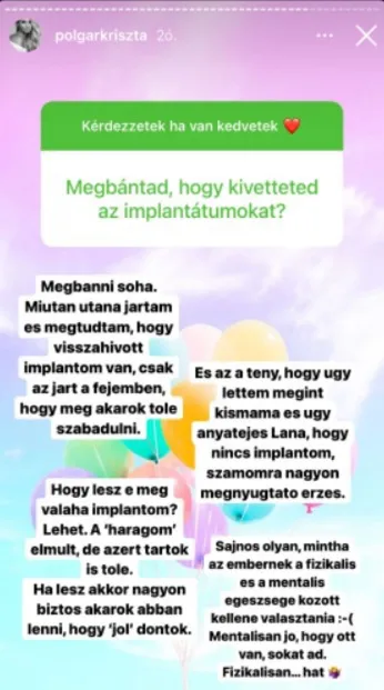 Most egy instagramos rajongói kérdésnél merült fel újra a téma. Azt kérdezték tőle, megbánta-e, hogy kivetette az implantátumokat?