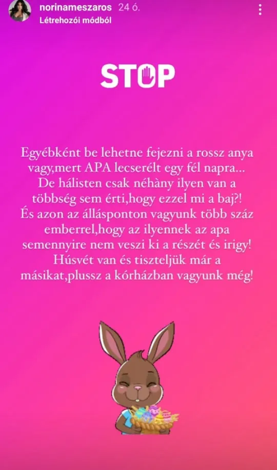 Rebekával eredendően az anyukája, Mészáros Norina volt bent a kórházba, mindössze fél napra váltotta le őt Young G, ám ez a kis idő is elég volt a netezőknek ahhoz, hogy páros lábbal szálljanak bele Norinába, és rossz anyának titulálják. A fiatal anyuka - aki egyébként is nehéz időszakon megy keresztül - nem sokáig tűrte szó nélkül a támadásokat, visszaszólt az őt kritizálóknak, teljes joggal.
